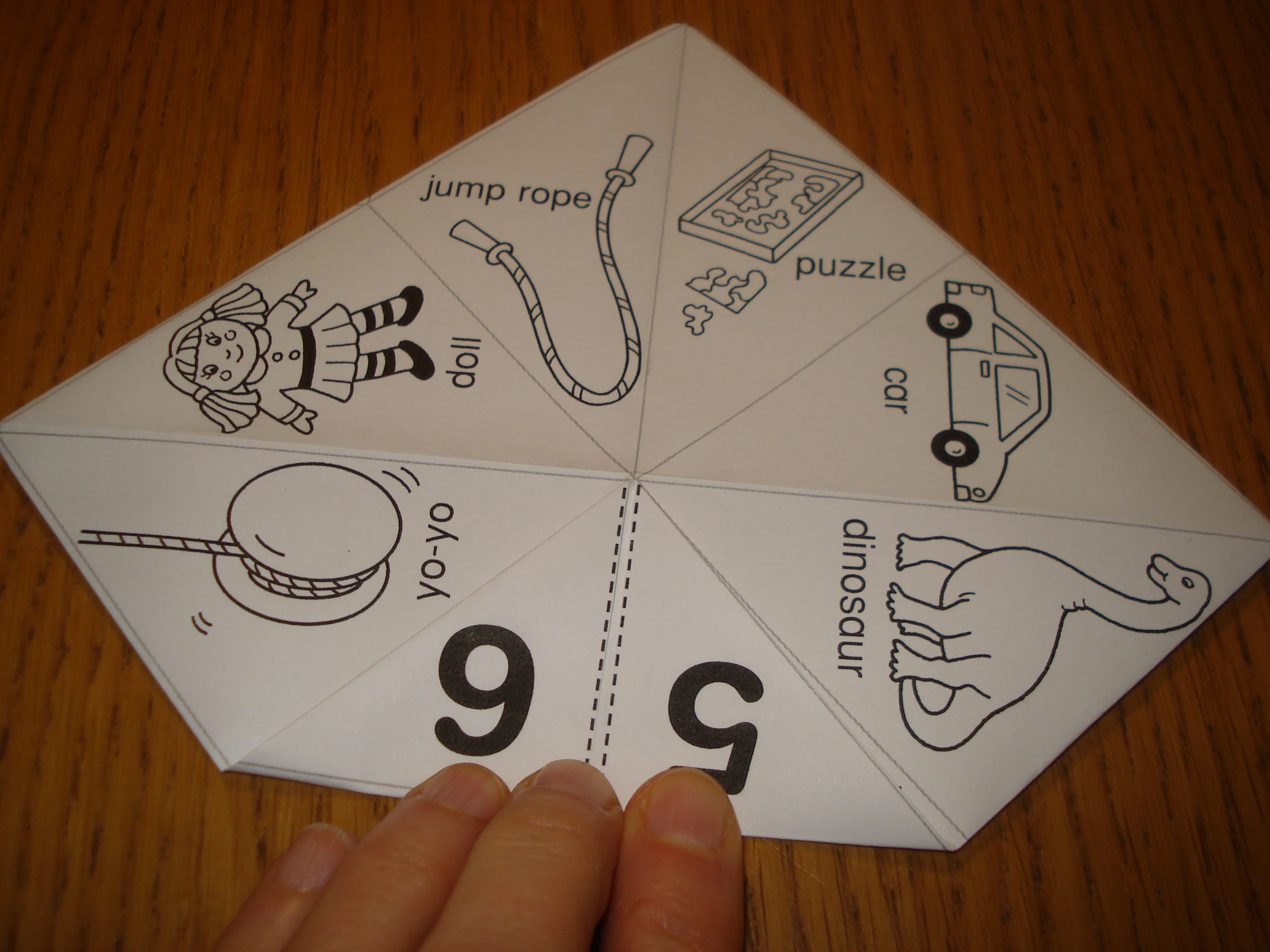 To make your own fortune teller, do your folding first.  Then open it up and add numbers, pictures, words, etc.  Instead of counting or saying the ABC’s, more advanced students can spell out words.