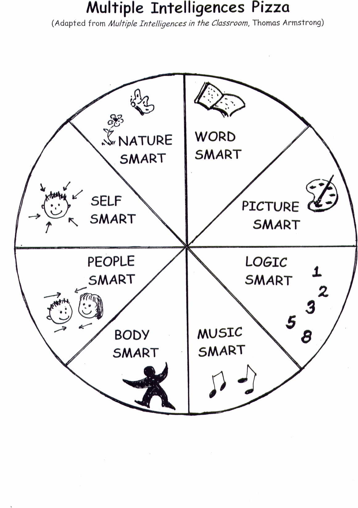 Later, Dr. Thomas Armstrong took this theory and made it even more practical for teachers of children by creating the following MI Pizza! (We’ve adapted it from the original.) He referred to each intelligence as a way of being “smart.”